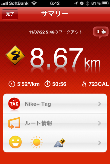 △ 腕立て伏せ20回、背筋20回のセット。   ランニング(7月の目標:  270km)   △ こちらは起きてすぐの東の空。キレイな朝焼け。台風一過。   △ ようやくちゃんと走れました。やはりこの日誌を溜めてしまうのはモチベーション低下の大きな要因っぽいのでくれぐれも気をつけよう。 8.6kmを48分。涼しいので結構良いペース。真夏もこれくらいだと走りやすいよねえ。     今日の走行距離/今週の走行距離/今月の走行距離/今年の走行距離: 8.6キロ/14.4キロ/136.1キロ/1,343.5キロ 7月の走行目標(270キロ)まで:あと133.9km 今週の走行目標(60.1キロ)まで:45.7km 今年の出走日数/トータル日数:201日/201日 出走率:1.000(’05年の通算.477、’06年.279、’07年.548、’08年.326、’09年.663、’10年1,000) 690日連続出走中