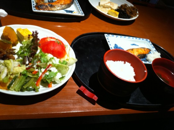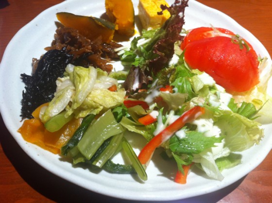 △ 大森で仕事。魚可祝というお店の鮭ランチ。このお店、サイドがブッフェスタイルで取り放題になっている。 2枚目がサイドの写真。野菜中心に。