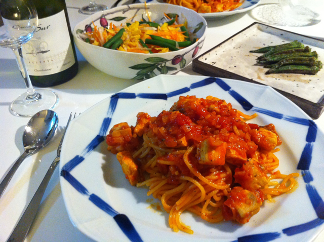 △ 夕食は僕が作ったカジキのトマトソースパスタと奥さん作のサラダ、それにオクラのバター焼きという組み合わせ。