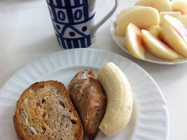 △ Pan Rizottaのパン2種と。フルーツはバナナと桃、コーヒー。
