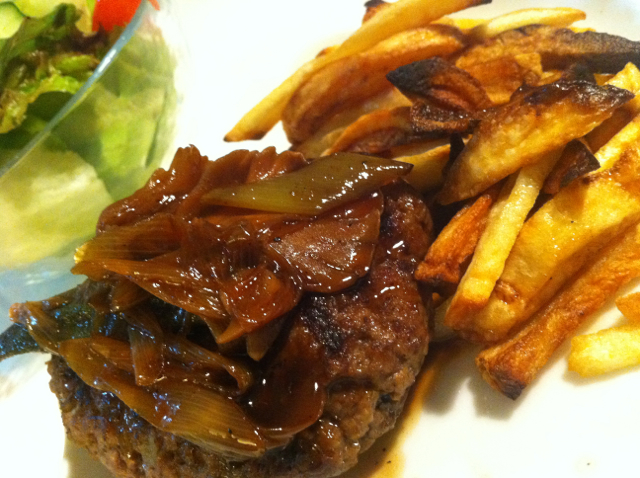 △ 晩ご飯は昨夜作り置いておいたハンバーグとポテト、サラダ、ご飯。