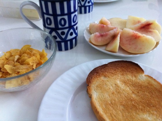 △ イギリスパンとコーンフレーク、それに桃とコーヒー。