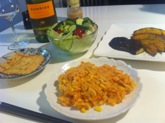 △ 夜ご飯は冷蔵庫の整理。チキンライス、焼き野菜、油揚げ、サラダ。