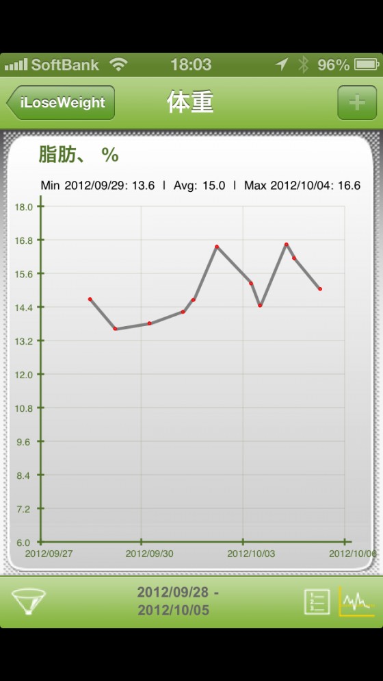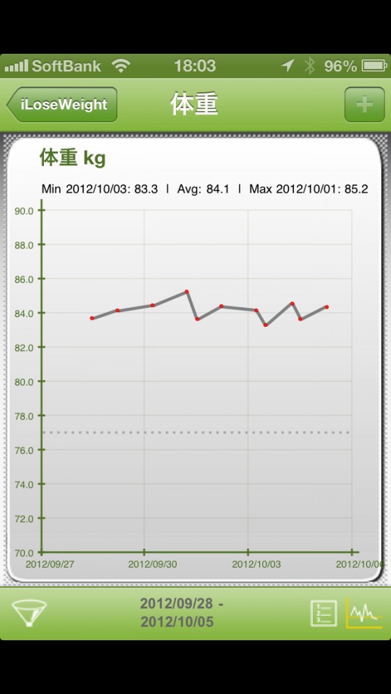 ヨーロッパと九州旅行が終わった直後からは2.5kmくらい落としたのだが、もう一踏ん張りしたいところ。