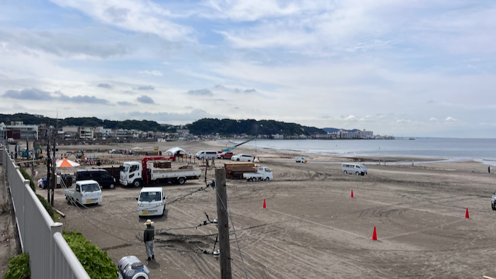 ▲ 外出前の1kmラン。海の家の設営を眺めながら走る。