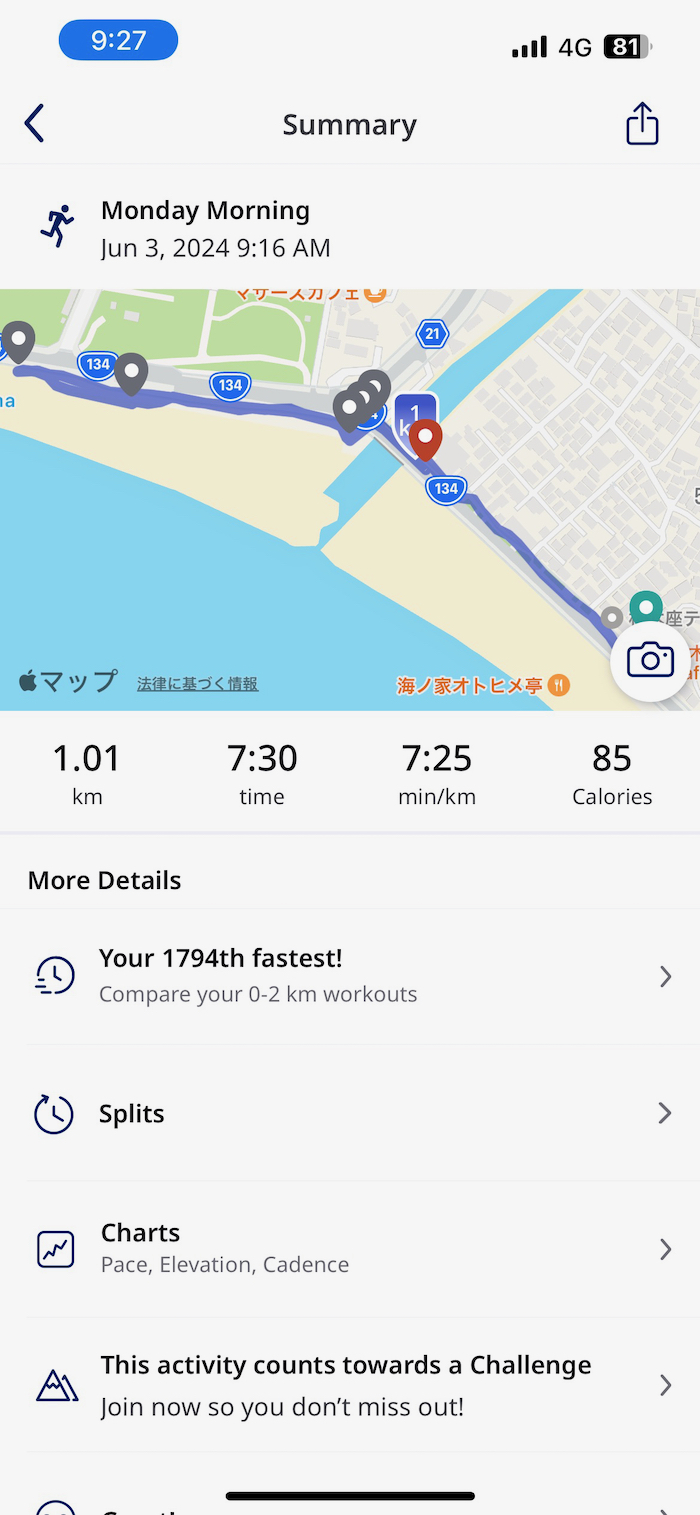 ▲ この日のラン: 1km/6月の累計: 8km/2024年の累計: 152km。湘南国際マラソンまであと181日。