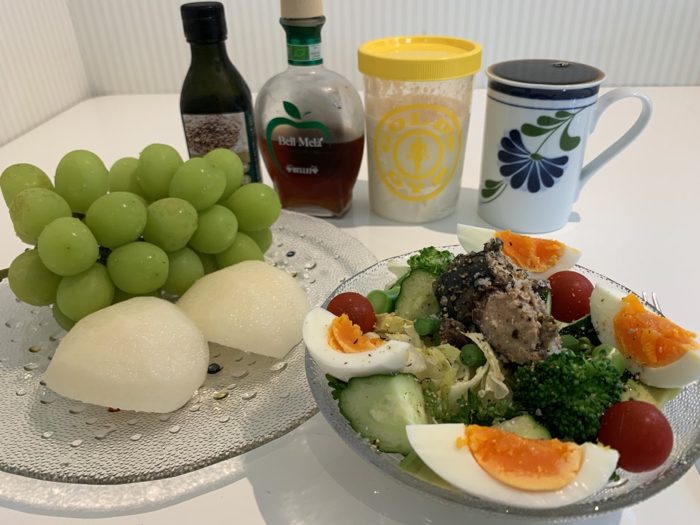 ▲ 今朝はサラダは亜麻仁油とアップルビネガーの組み合わせで、トッピングはサヴァ缶レモンバジル味。