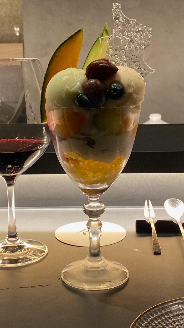▲ メロンと和栗のパフェと赤ワイン。いい感じ。
