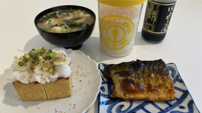 ▲ サバの一夜干し、厚揚げ焼き大根おろし、具たくさん御御御付け、プロテイン。