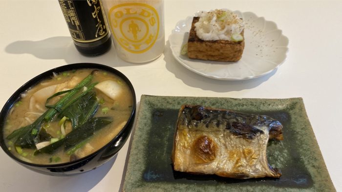 ▲ サバの一夜干し、厚揚げ焼き大根おろし、具沢山の御御御付け、そしてプロテイン。