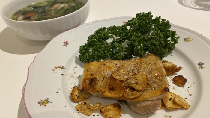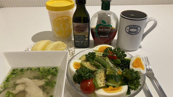 ▲ 前夜仕込んだ4回目の鶏胸肉スープとサラダ。