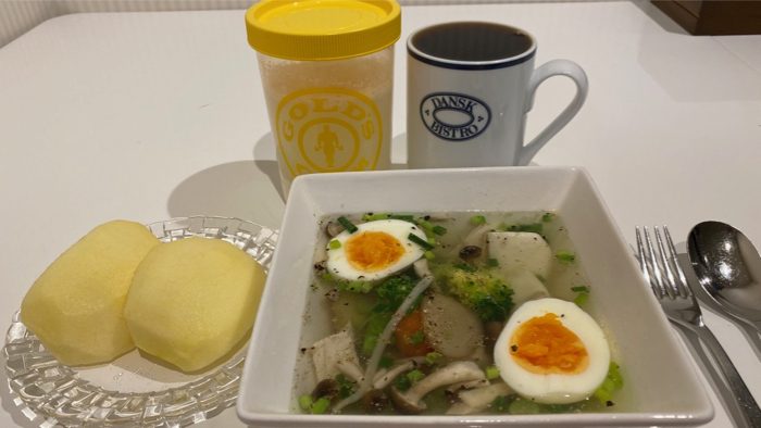 ▲ 鶏胸肉スープに野菜とたまごを投入。