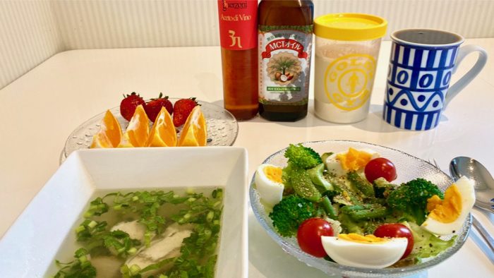 ▲ ボディメイクサラダ、鶏胸肉スープ、フルーツ、なみなみコーヒー、プロテイン。