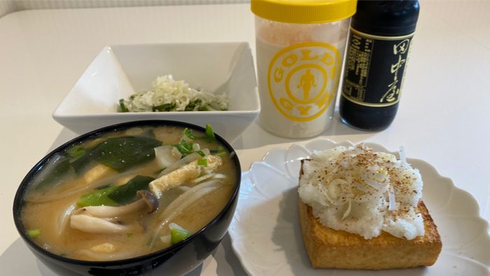 ▲ オクラ納豆、厚揚げ焼き大根おろし、御御御付け、プロテイン。