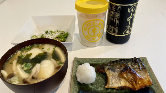▲ サバの一夜干し、オクラ納豆、御御御付け、プロテイン。