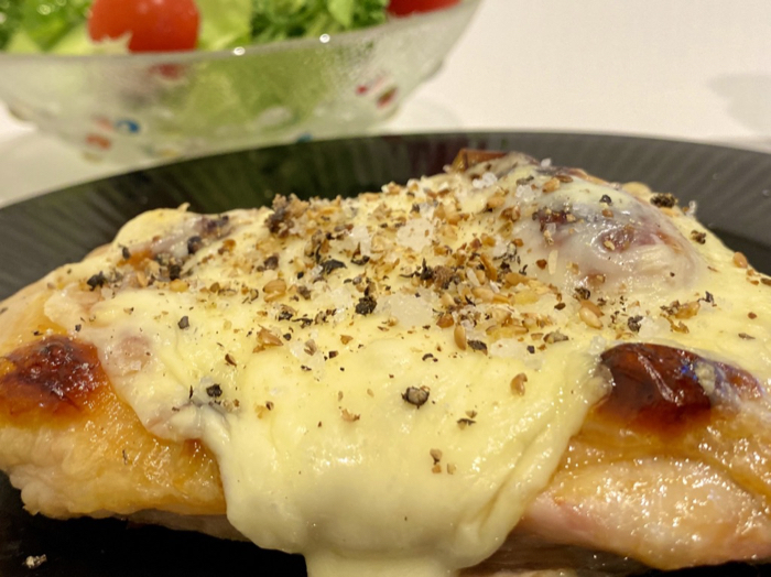 ▲ 鶏もも肉のチーズグリル、サラダ。