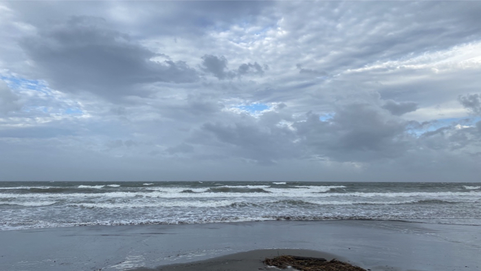 ▲ 風のせいで波頭の飛沫が海岸に向けて飛びまくる。