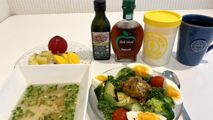 ▲ ボディメイクサラダ、鶏胸肉スープ、フルーツ、プロテイン、なみなみコーヒー。