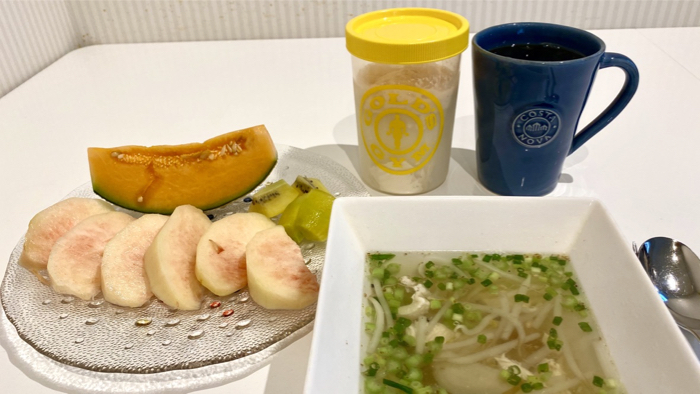 ▲ 鶏胸肉スープ、フルーツ、プロテイン、なみなみコーヒー。