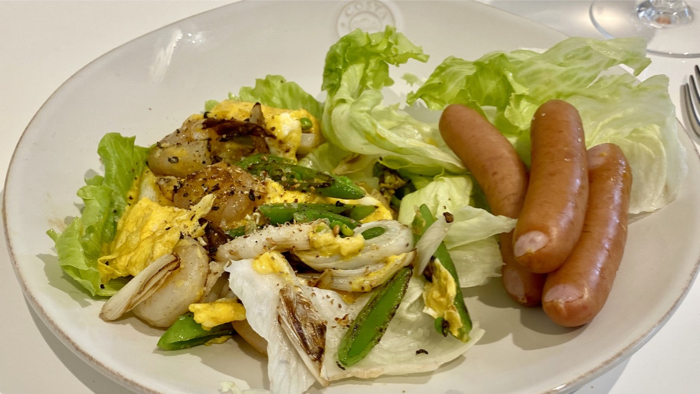 エビとスナップエンドウの玉子炒め、ポーク粗びきソーセージ、サラダ。