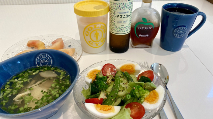 ▲ ボディメイクサラダ、鶏胸肉スープ、フルーツ、プロテイン、なみなみコーヒー。