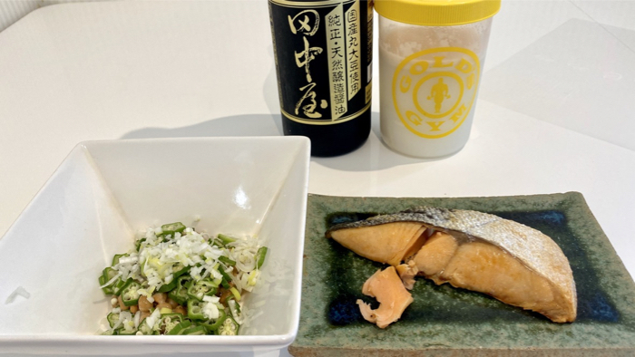 ▲ 鮭の一夜干し、オクラ納豆、プロテイン。