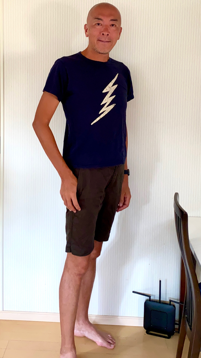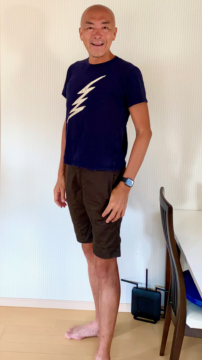 ▲ アニエスbの稲妻Tシャツにモスグリーンのショートパンツ。