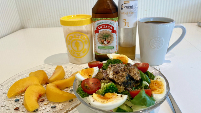 ▲ ボディメイクサラダ、フルーツ、プロテイン、なみなみコーヒー。