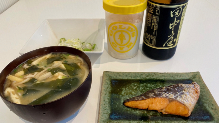 ▲ 鮭の一夜干し、オクラ納豆、御御御付け、プロテイン。