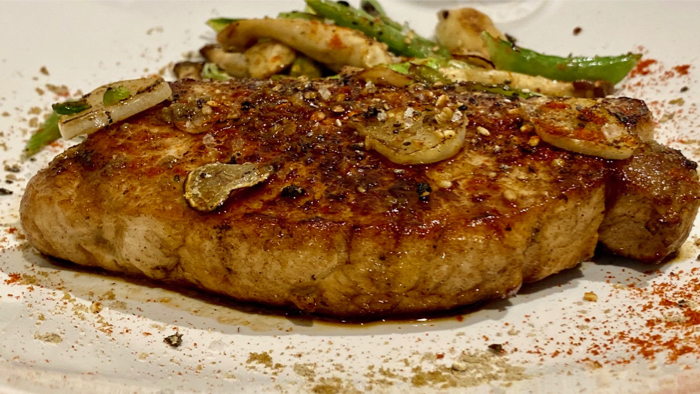 ▲ 厚切りポークソテー。クミンとカルダモンとパプリカでエスニック風に。