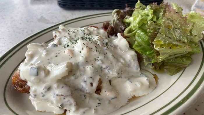 ▲ お気に入りのチキン南蛮を食べていたら、テラス席に早くも雨が降り出した。
