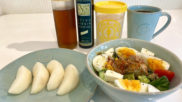 ▲ ボディメイクサラダ、フルーツ、プロテイン、コーヒー。