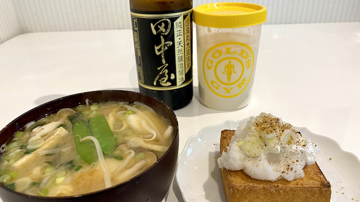 ▲ 厚揚げ焼き大根おろし、御御御付け、プロテイン。