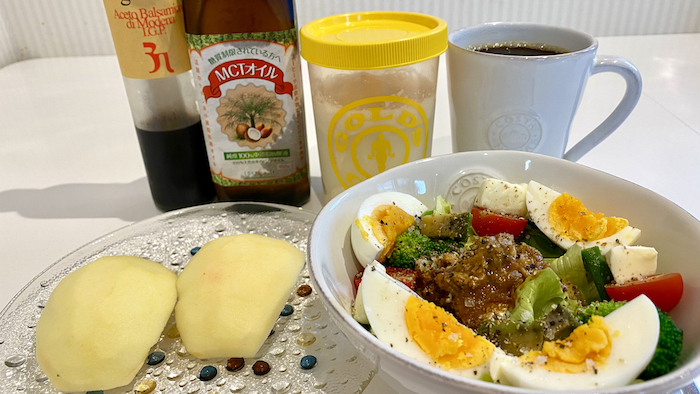 ▲ ボディメイクサラダ、秋映りんご、プロテイン、コーヒー。