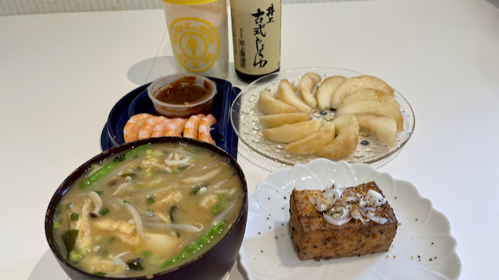 五目厚揚げ焼き、具沢山の豚汁、カクテルシュリンプ、桃、プロテイン。