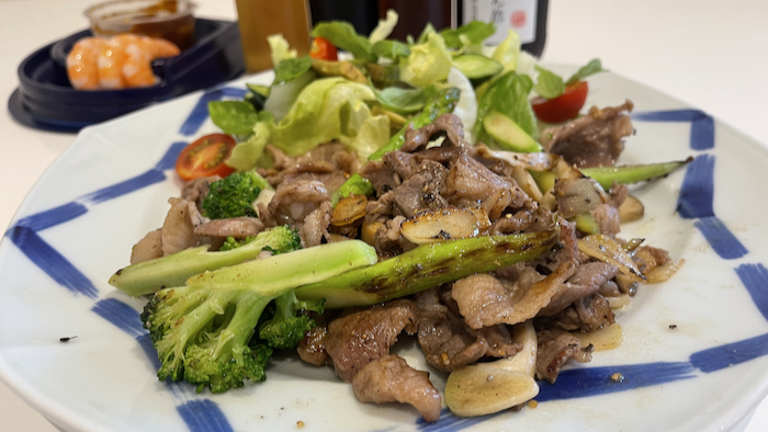 ▲ 晩ごはんはニュージーランド産ラム肉と野菜のソテーとサラダ、カクテルシュリンプ。