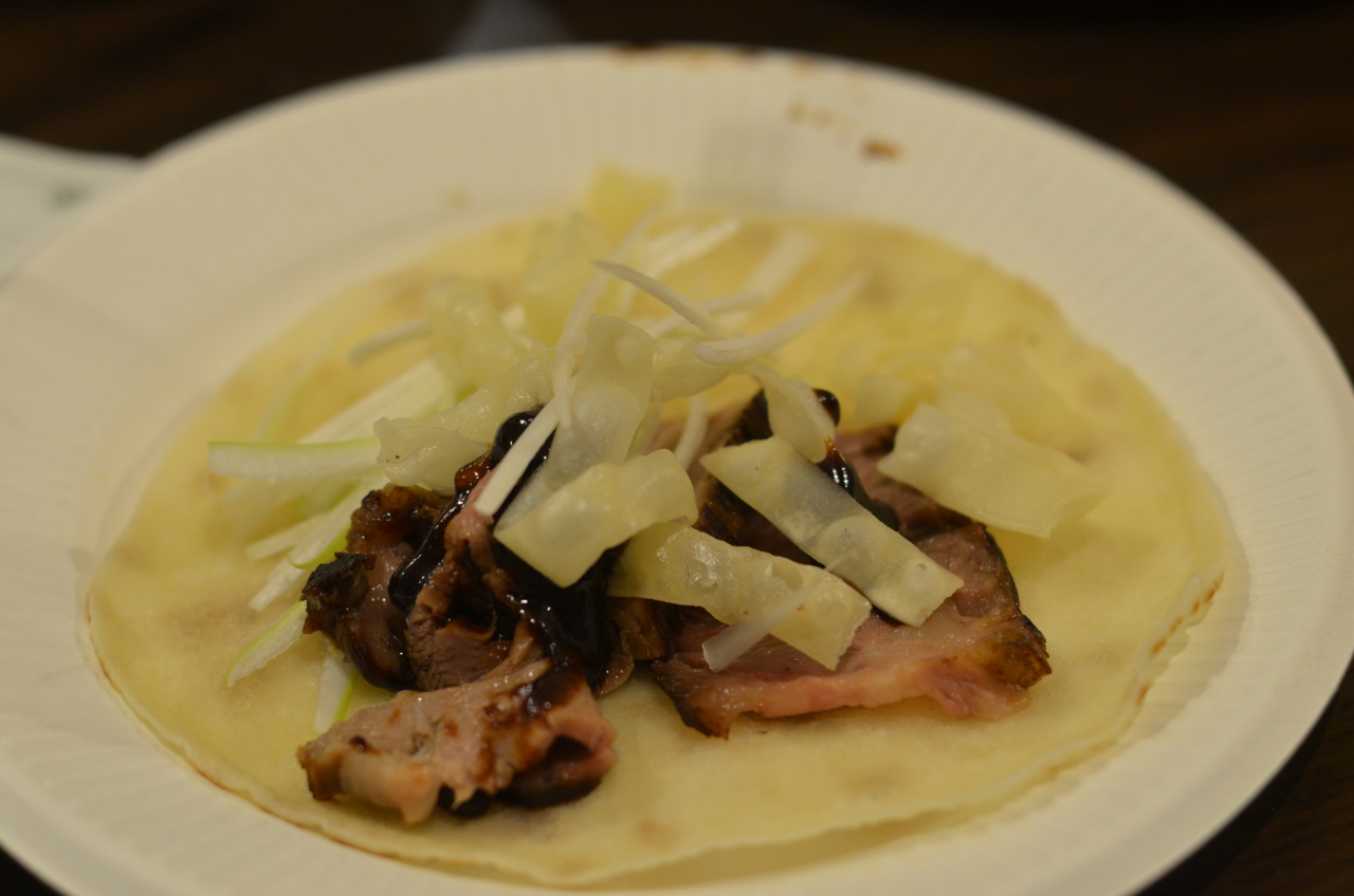 もちろん北京ダックの皮も手作りとのこと。これ乗せてみたところ。このあと巻いて食すわけだが、本気で美味い!