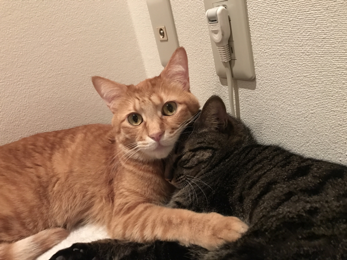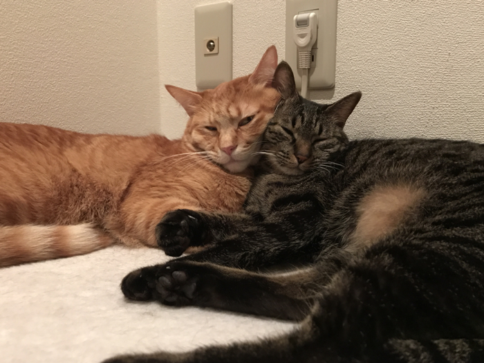セッションが終わって寝室に行ったら、ネコたちがこんな格好のまま眠っていた。
