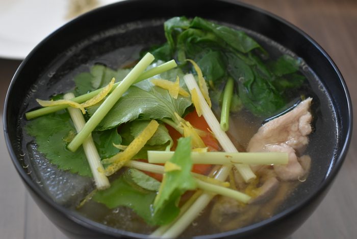 ▲ お雑煮は関東のかつおだしに鶏肉の入った澄まし汁。