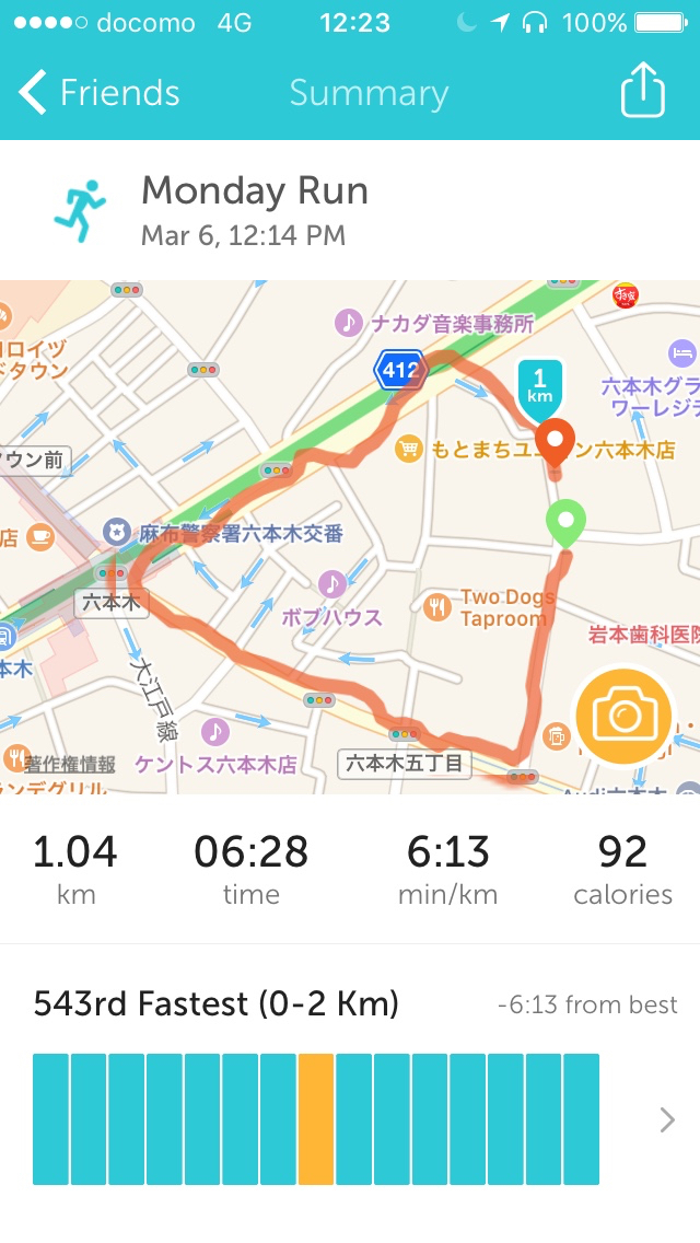 雨が降っていたのとずっと4km以上走っていて脚に張りを感じたので、1kmに。