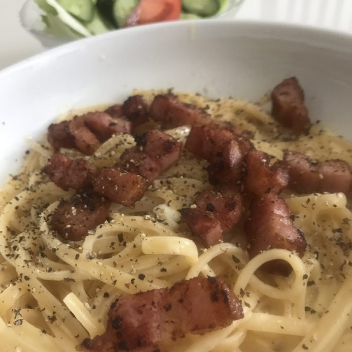 ▲ お昼ごはんはカルボナーラを作って食べる。
