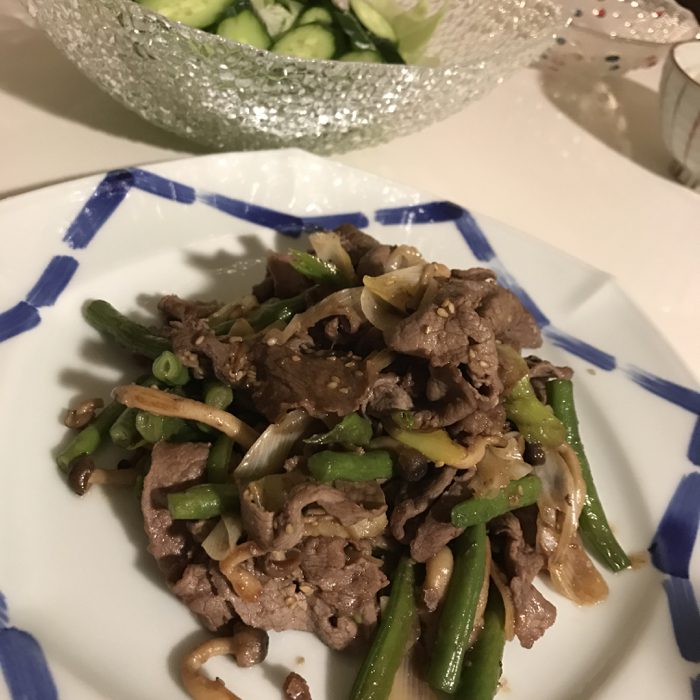 ▲ 夜は僕が担当で牛肉と野菜の炒め物。
