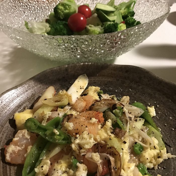 夕食は僕が担当で海老の玉子炒め。