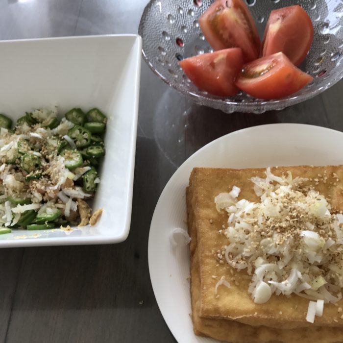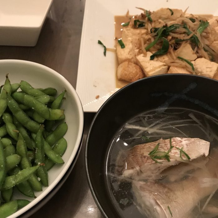 晩ごはんは奥さん作で、真鯛のお吸い物、枝豆、豆腐ともやしのバター炒め。