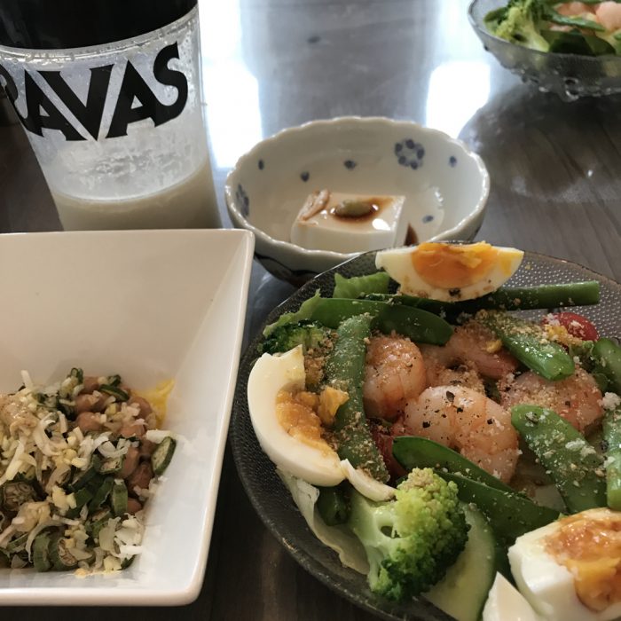 今日のランチでは、オクラ納豆に亜麻仁油、サラダにオリーブオイル、プロテインにMCTオイル。