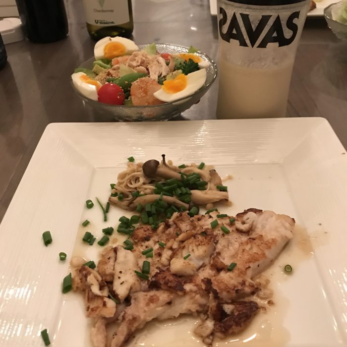 夜は、ヒラメのバター焼きにバター、サラダに亜麻仁油、プロテインにMCTオイルとやってみた。