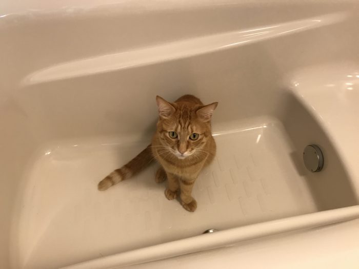 ▲ 朝、洗面所で歯を磨いていたら、お風呂場からごそごそ音がするので見てみたら、バスタブの中にソルがいた。