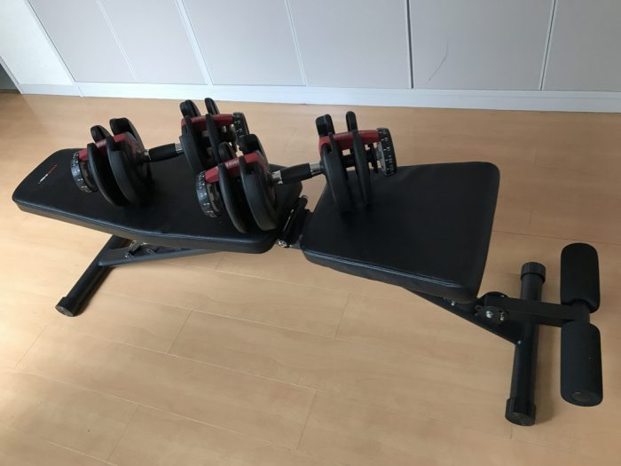ダンベルベンチプレス、16.5kgで13回、10回、10回。いまのところこれがギリギリという感じ。