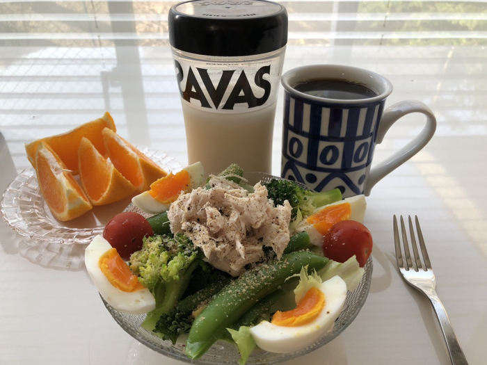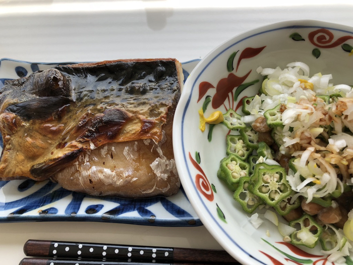 ▲ 昼ごはんはサバとおくら納豆、そしてMCTオイル入りのプロテイン。