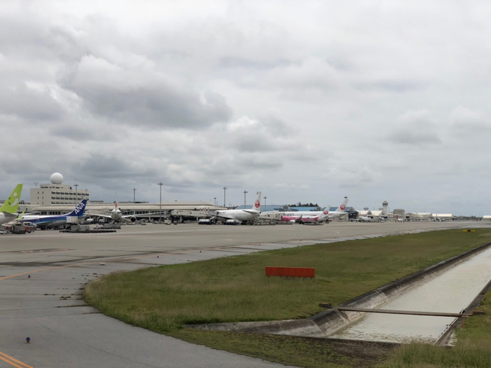 ▲ 定刻どおりに那覇空港についたのに、駐機場が空いてなくて、ちょっと待つことになった。